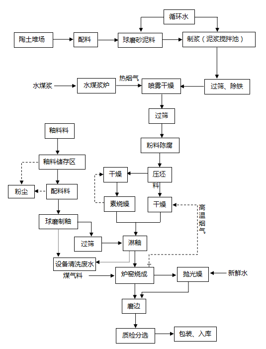 1)生產裝置:1#、2#線生產車間、球磨車間、煤氣站